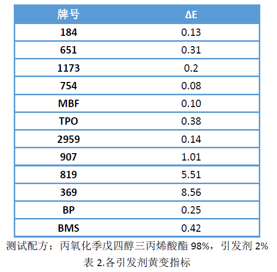 表2是在以丙氧化季戊四醇三丙烯酸酯為主體,不加光引發(fā)劑為空白參照的,各光引發(fā)劑黃變指標。